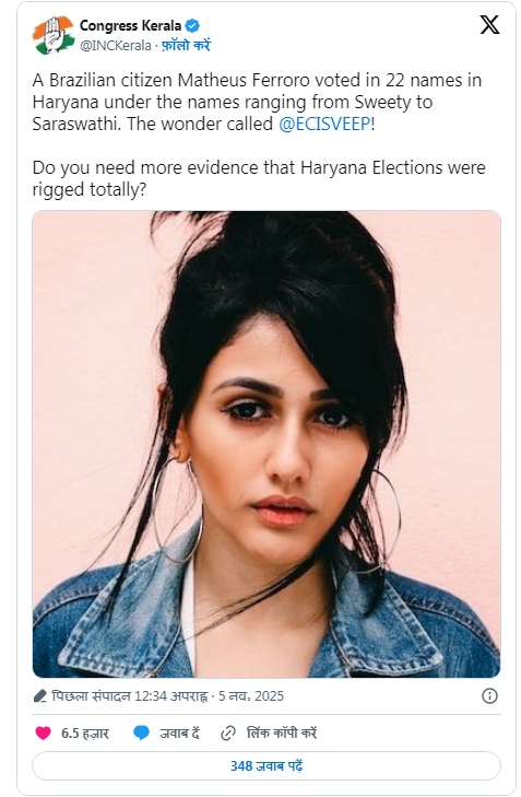 Rahul Gandhi Allegations : कांग्रेस के नेता राहुल गांधी ने आज एक प्रेस कॉन्फ्रेंस में हरियाणा विधानसभा चुनाव में कथित वोट चोरी को लेकर गंभीर आरोप लगाए हैं। राहुल गांधी ने कहा कि कांग्रेस की जीत को जानबूझकर हार में बदल दिया गया और चुनाव प्रक्रिया में गड़बड़ी की गई। इस संदर्भ में उन्होंने एक ' H-Files' प्रेजेंटेशन भी प्रस्तुत किया, जिसमें उन्होंने वोट डालने में इस्तेमाल की गई एक महिला की तस्वीर का हवाला दिया, जो असल में ब्राजील की मॉडल मैथियस फेरोरो की थी। राहुल गांधी ने आरोप लगाया हरियाणा में 22 वोट एक मॉडल के नाम पर दर्ज किए गए, जो अलग-अलग नामों से वोट डालने के आरोप में शामिल थी। उन्होंने कहा कि यह महिला कभी सीमा, कभी स्वीटी, और कभी सरस्वती बनकर वोट डालने में शामिल थी। हालांकि, राहुल गांधी के द्वारा उठाए गए इस मुद्दे की जांच में यह सामने आया कि मैथियस फेरोरो एक फोटोग्राफर का नाम है, जिनकी तस्वीरें कई ऑनलाइन प्लेटफॉर्म्स पर रॉयल्टी-फ्री इमेज के रूप में उपलब्ध हैं।