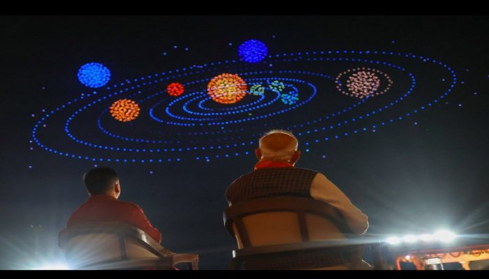 अरब सागर के ऊपर आसमान में रोशनी के एक अनोखे मेल से, ड्रोन का इस्तेमाल करके अलग-अलग पॉइंटिलिस्ट तस्वीरें और रंगीन आकृतियां बनाई गईं। आसमान में उभरते चमकदार दृश्य लोगों के लिए आकर्षण का मुख्य केंद्र बन गए। ड्रोन का इस्तेमाल करके आसमान में सोमनाथ मंदिर, त्रिशूल, ओम, वीर हमीरजी, अहिल्याबाई होल्कर, सरदार वल्लभभाई पटेल और नरेंद्र मोदी की आकृतियाँ दिखाई गईं। हर बदलती आकृति के साथ, मंदिर परिसर तालियों की गड़गड़ाहट और "हर हर महादेव" के नारों से गूंज उठा। इसके बाद, रंगीन आतिशबाजी ने दर्शकों को मंत्रमुग्ध कर दिया। इस अनोखे आयोजन ने पवित्र सोमनाथ धाम में उत्सव और खुशी का माहौल बना दिया। इस मौके पर प्रधानमंत्री नरेंद्र मोदी के साथ गुजरात के मुख्यमंत्री भूपेंद्र पटेल और कई राज्य मंत्री मौजूद थे।