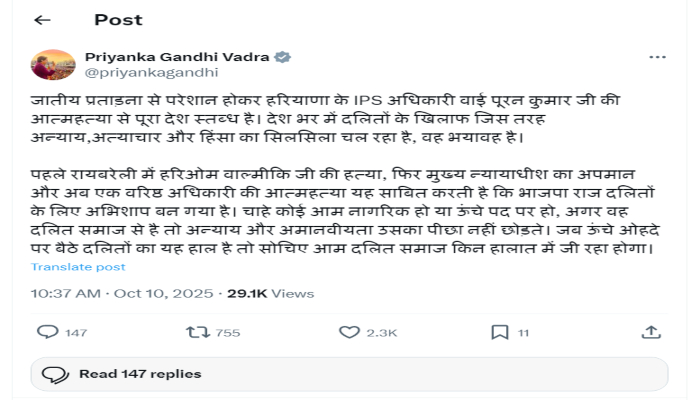 प्रियंका गांधी ने शुक्रवार को सोशल मीडिया पर पोस्ट करते हुए लिखा कि हरियाणा के आईपीएस वाई. पूरन कुमार की आत्महत्या ने पूरे देश को झकझोर कर रख दिया है।