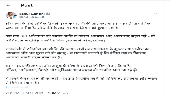 जातीय उत्पीड़न से परेशान होकर उन्होंने यह कदम उठाया। यह घटना एक व्यक्ति की नहीं, बल्कि पूरी दलित जाति की पीड़ा की प्रतीक है। उन्होंने इस घटना को उत्तर प्रदेश के रायबरेली में हरिओम वाल्मीकि की हत्या और मुख्य न्यायाधीश बी. आर. गवई पर जूता फेंकने की कोशिश से जोड़ते हुए कहा कि यह सब एक सुनियोजित सामाजिक वातावरण को दर्शाता है, जहां दलितों को लगातार निशाना बनाया जा रहा है। प्रियंका गांधी ने लिखा, पहले हरिओम वाल्मीकि की पीट-पीटकर हत्या, फिर भारत के मुख्य न्यायाधीश का अपमान, और अब एक वरिष्ठ दलित अधिकारी की आत्महत्या, ये घटनाएं भाजपा के शासन को दलितों के लिए अभिशाप साबित कर रही हैं। जब ऊंचे पदों पर बैठे दलित सुरक्षित नहीं हैं, तो आम दलितों की स्थिति की कल्पना करना ही भयावह है।