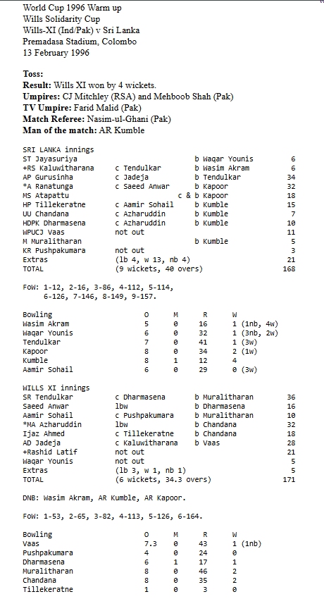11 फरवरी 1996 को कलकत्ता (अब कोलकाता) के ईडन गार्डन्स में विश्व कप का उद्घाटन समारोह था। वहीं 'पिलकॉम' (PILCOM - पाकिस्तान-भारत-लंका समिति) की एक आपात बैठक हुई। श्रीलंका क्रिकेट बोर्ड के तत्कालीन अध्यक्ष अना पुंचिहेवा याद करते हैं, "जब ऑस्ट्रेलिया ने आने से मना किया, तो हमें लगा कि सब खत्म हो गया। लेकिन उस बैठक में एक ऐसा विचार आया जिसने इतिहास बदल दिया। तय हुआ कि भारत और पाकिस्तान अपनी विश्व कप तैयारियों को बीच में छोड़कर अपने स्टार खिलाड़ियों को श्रीलंका भेजेंगे ताकि दुनिया को दिखाया जा सके कि कोलंबो सुरक्षित है।" महज 48 घंटों के भीतर योजना पर अमल हुआ। भारत और पाकिस्तान के छह-छह शीर्ष खिलाड़ियों को चुनकर एक 'फ्रेंडशिप इलेवन' बनाई गई।