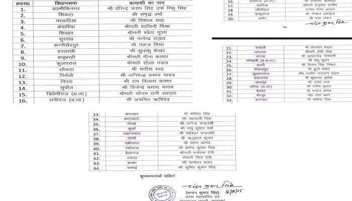 जेडीयू द्वारा जारी सूची के अनुसार, रूपौली से कलाधर मंडल, जबकि मंत्री लेसी सिंह फिर से धमधा से चुनाव लड़ेंगी। इसी तरह, दुलालचंद गोस्वामी को कदवा, विजय सिंह निषाद को बरारी, शीला मंडल को फुलपरास, बुलो मंडल को गोपालपुर, ललित नारायण मंडल को सुल्तानगंज से और मंत्री सुमित कुमार सिंह को चकाई से उम्मीदवार बनाया गया है।