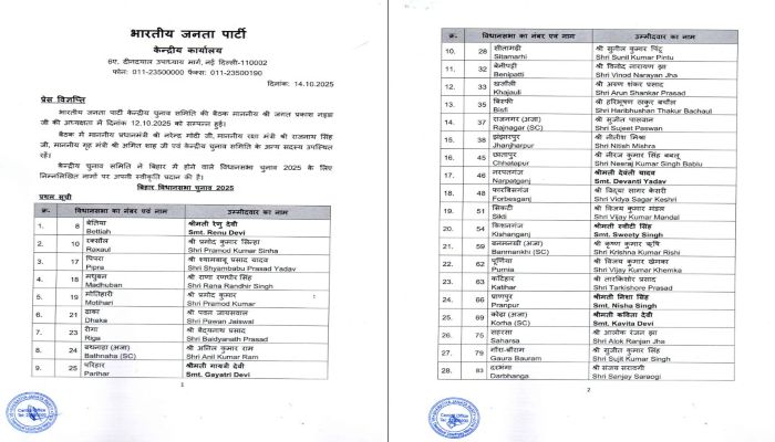 Bihar BJP Candidates List 2025: बिहार विधानसभा चुनाव 2025 के लिए भाजपा ने अपने उम्मीदवारों की पहली सूची जारी कर दी है। भाजपा ने इस सूची में 71 उम्मीदवारों को टिकट दिया है। इस सूची में दोनों डिप्टी सीएम के साथ-साथ बिहार के कई मंत्रियों के नाम भी शामिल हैं। पार्टी ने बताया कि इस सूची में सम्राट चौधरी, विजय सिन्हा, तारकिशोर प्रसाद, प्रेम कुमार, मंगल पांडे, रेणु देवी, कृष्ण कुमार, नितिन नवीन और राम नारायण मंडल शामिल हैं।