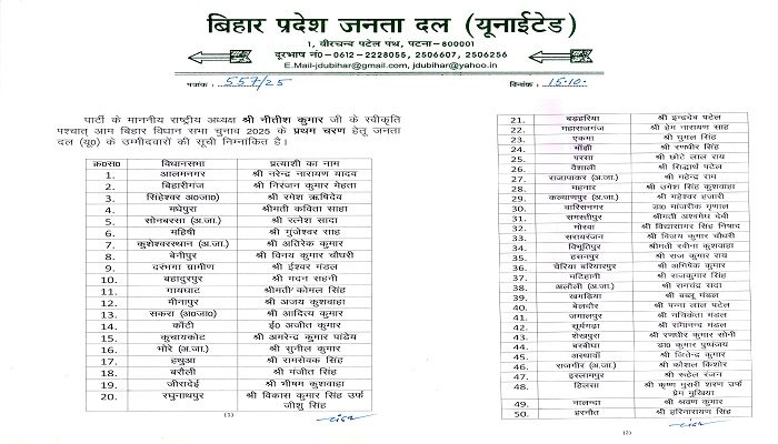 JDU Candidates List: बिहार विधानसभा चुनाव 2025 के लिए एनडीए का हिस्सा जेडीयू ने बुधवार को अपने 57 उम्मीदवारों की पहली लिस्ट जारी कर दी है। इस सूची में उन सीटों के कैंडिडेट भी शामिल हैं जो पहले एनडीए के एक अन्य घटक दल, लोक जनशक्ति पार्टी (रामविलास) के खाते में जाने की उम्मीद थी। साथ ही जेडीयू ने दो मौजूदा विधायकों का टिकट काट दिया है। इसके अलावा तीन बाहुबलियों को मैदान में उतारा है। जेडीयू की पहली सूची में पार्टी ने मोकामा से कद्दावर नेता अनंत सिंह, सोनबरसा से मंत्री रत्नेश सदा, फुलवारी से श्याम रजक, राजगीर सीट से मौजूदा विधायक कौशल किशोर और हिलसा सीट से कृष्ण मुरारी शरण उर्फ प्रेम मुखिया को टिकट दिया है।